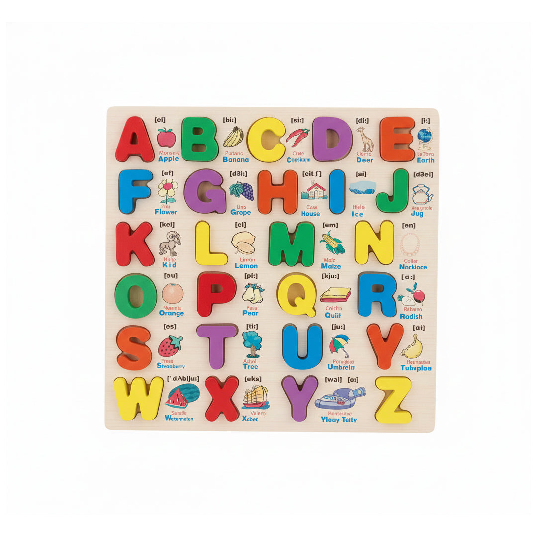 Abecedario didáctico elaborado en madera natural, diseñado para apoyar el aprendizaje de las letras de forma visual, táctil y divertida. Incluye letras del alfabeto en colores vivos, acompañadas de ilustraciones que ayudan a asociar cada letra con palabras y objetos conocidos.